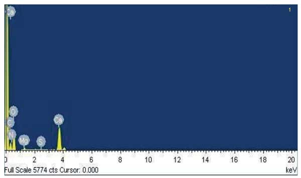 活性炭的表面化學(xué)成分是通過使用能量色散X射線(EDX)光譜確定的。得到的光譜見圖2,C、N、0、Mg、Ca的百分比分別為7.64%、14.53%、35.31%、0.70%、41.80%。FTIR結(jié)果支持C、N和O的存在,該結(jié)果表明存在羰基和胺基團。除此之外,高百分比的Ca表明主要是鈣的性質(zhì)。此外,光譜中出現(xiàn)Mg表明Mg化合物與碳和氧強烈結(jié)合。因此,無論是用熱蒸餾水還是冷蒸餾水,都不容易通過洗滌去除。