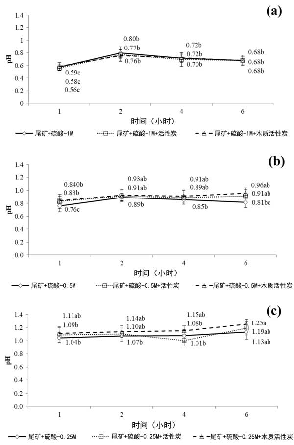 在H2SO4-1M中用活性炭和木質(zhì)活性炭處理的對(duì)照尾礦在圖2提供,(3a)中的pH變化,H2SO4-0.5M(3b)和H2SO4-0.25M(3c)浸出溶液。關(guān)于浸出實(shí)驗(yàn)期間的pH演變,盡管活性炭顯示堿性pH,但在不存在或存在活性炭的情況下觀察到小的差異。選擇硫酸作為浸出液是因?yàn)樗梢杂行У剡x擇性溶解Zn化合物而不是Pb和Ca。相反,樣品中的氧化鉛和碳酸鹽會(huì)溶解在硫酸溶液中,然后以硫酸鉛的形式沉淀。然而,當(dāng)在浸出液中加入活性炭時(shí),氧化還原電位的下降幅度高于加入木質(zhì)活性炭后。這一事實(shí)可能與碳基材料與系統(tǒng)中存在的氧化劑種類和礦物質(zhì)之間的不同相互作用有關(guān)。事實(shí)上,觀察到在木質(zhì)活性炭催化的黃銅礦浸出過程中氧化還原電位降低,并將這種影響歸因于礦物和木質(zhì)活性炭在酸性介質(zhì)中的電偶相互作用。