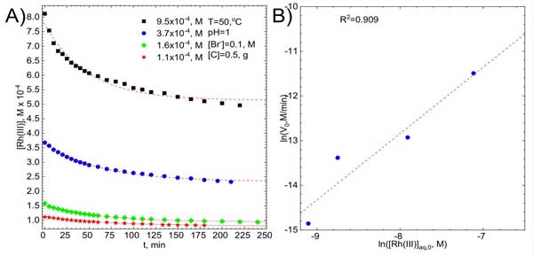 很明顯,銠溴化物絡離子的初始濃度將影響它們在電解質(zhì)中的平衡濃度和吸附過程的速率。這是圖2A,其中繪制了在T=50℃下在攪拌溶液中獲得的動力學曲線,攪拌速率為1200rpm。得到離子之間的線性相關性,確定系數(shù)接近圖2B。擬合線的斜率等于1.48±0.33,證實了初始假設,即關于銠溴化物絡離子初始濃度的反應的第一級。吸附動力學還應取決于活性炭的表面積,前提是系統(tǒng)不受擴散控制。這已針對不同濃度的吸附劑進行了驗證。