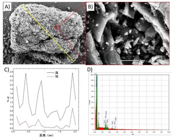 圖3:吸附試驗后活性炭樣品的SEM圖像(A)表示進行EDS分析的線的總體視圖,(B)進行EDS點分析的區(qū)域的放大率,(C)EDS線分析結(jié)果,(D)選定點的EDS光譜。