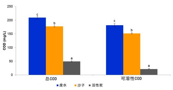 圖2:通過(guò)砂濾器和活性炭吸附柱系統(tǒng)處理經(jīng)過(guò)生物處理的含殺菌劑的流出物時(shí)的總COD濃度和可溶性COD濃度。對(duì)于每個(gè)測(cè)量參數(shù),由相同字母指定的條形在5%的水平上沒(méi)有顯著差異。