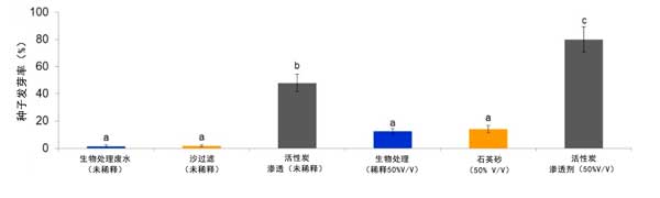 圖3:經(jīng)生物處理的含殺菌劑流出物(未稀釋或稀釋50%)在通過(guò)砂濾器和活性炭吸附柱系統(tǒng)處理前后的發(fā)芽指數(shù)(GI)值。由相同字母指定的條形在5%的水平上沒(méi)有統(tǒng)計(jì)差異。