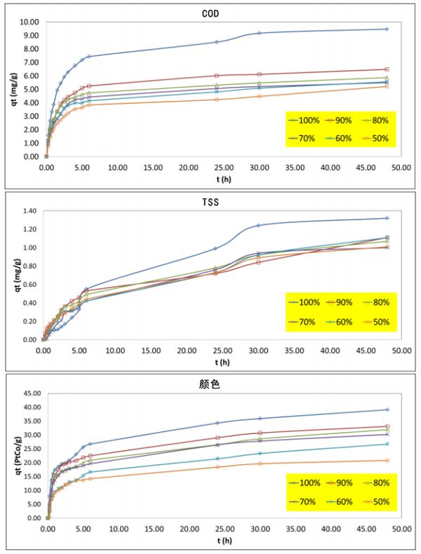 在不同溫度下,棕櫚油廢水濃度如圖2所示。所有初始濃度下的COD、TSS和顏色均顯示出隨接觸時間增加的吸附吸收。在早期,吸收迅速增加,表明有大量活性位點可用。然后,在達到平衡時,它最終顯示出飽和曲線,這可能是由于吸附劑表面的單層污染物覆蓋。在所研究的操作條件下,吸附吸收或活性炭吸附的污染物量在30小時的平衡時間(圖2)達到最大值。當廢水濃度從50%增加到100%時,顏色也會發(fā)生變化。然而,隨著廢水濃度的增加,COD、TSS和色度去除率降低。這一現(xiàn)象表明,除了由于活性炭吸附大量污染物的能力有限外,由于活性炭上用于處理濃縮棕櫚油廢水的活性位點堵塞,污染物的吸附量減少。
