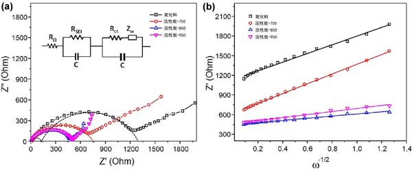 圖2:a電化學阻抗譜,b是阻抗與炭化料和活性炭角頻率平方根倒數(shù)之間的線性關系。