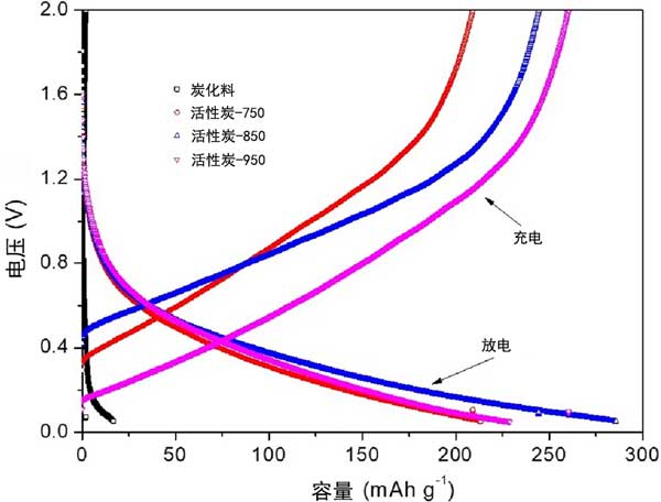 充放電曲線評估了活性炭的的電化學性能,不同溫度活化的活性炭電極如圖3所示。CD測試是在0.25C的電流密度速率下進行的;罨瘻囟忍岣吡顺潆娙萘;钚蕴繕悠返母叱潆娙萘繛260.36mAh/g-1,而炭化料樣品的低充電容量為1.98mAh/g-1。這是因為活化的樣品可以吸收很多的鋰離子。放電曲線顯示三個不同的電位區(qū)域,這可能歸因于不同的機制。0到0.12V的區(qū)域對應于鋰離子從隨機取向的小分子堆疊中的微孔中脫出。0.12到0.8V的區(qū)域歸因于鋰離子從無序石墨烯層中脫出。高于0.8V的區(qū)域對應于鋰從各種邊緣位置或石墨烯層中含H-/O官能團的脫嵌。