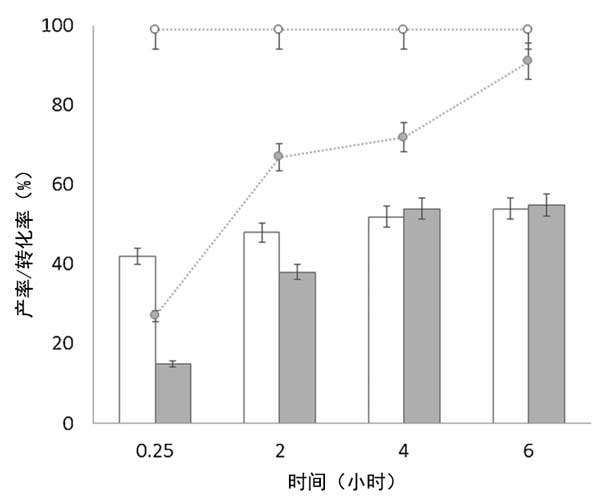 圖1:活性炭載氧化錫(白色條和點(diǎn))和氧化鋅(灰色條和點(diǎn))催化劑下果糖到乳酸乙酯的產(chǎn)率(條)和轉(zhuǎn)化率(點(diǎn))。