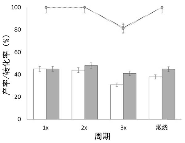 圖2:在160℃的20mL乙醇中從葡萄糖(0.1g)催化劑氧化錫活性炭(白色)和氧化鋅活性炭(灰色)的回收實(shí)驗(yàn)中乳酸乙酯的轉(zhuǎn)化率(點(diǎn))和產(chǎn)率(條)。