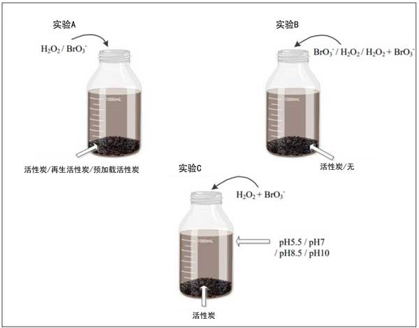 在對50家飲用水公用設(shè)施進行的調(diào)查中,獲得過氧化氫和溴化物的平均值來當(dāng)做測試用水。在所有實驗中,批量反應(yīng)器都用薄箔包裹。制備0.052µmol/L溴酸鈉溶液并加入間歇反應(yīng)器中以獲得0.5µmol/L溴酸鹽的濃度。高級氧化工藝中的出水殘留過氧化氫濃度不會超過180µmol/L。因此,在本研究中,將150µmol/過氧化氫加入到間歇式反應(yīng)器中。如圖1所示,在23–27℃的環(huán)境溫度下,使用36個批次玻璃瓶進行了一系列實驗。活性炭用量始終為5g/L,過氧化氫和溴酸鹽濃度始終分別為150µmol/L和0.5µmol/L。所有裝有過氧化氫的間歇式反應(yīng)器都用鋁箔覆蓋,以防止過氧化氫被光潛在降解。在如圖1所示的實驗中,使用16個間歇式反應(yīng)器和三種不同的活性炭(活性炭、再生活性炭和預(yù)加載活性炭)來研究不同運行時間的活性炭對溴酸鹽和過氧化氫的去除,該實驗涉及八個處理組。