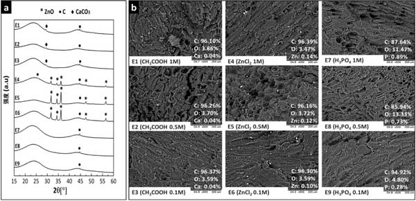 活性炭的X射線衍射圖如圖1-a所示。峰值在2θ=44在所有衍射圖中觀察到的6°歸因于對應于石墨(00-001-0646)的(101)平面。與其他材料不同,活性炭的衍射圖也顯示在2θ=26.4°歸因于石墨(00-001-0646)的(002)平面。ZnO和CaCO3可能是在熱處理過程中作為原材料組分和活化劑之間二次化學反應的產(chǎn)物或由于前體中固有的殘留礦物質(zhì)含量而產(chǎn)生的。經(jīng)過掃描電鏡分析500倍的SEM顯微照片如圖1-b所示。觀察到所有活性炭都表現(xiàn)出異質(zhì)表面形態(tài),其由不規(guī)則形式的成組薄片組成。在用ZnCl2活化的碳的表面上觀察到與氧化鋅相對應的沒有特定形狀的白色小顆粒(通過XRPD分析證實)。此外,EDS分析顯示存在分散在整個表面的碳(C)、氧(O)和鋅(Zn),從而證實了ZnO顆粒分散在這些吸附劑的表面上。