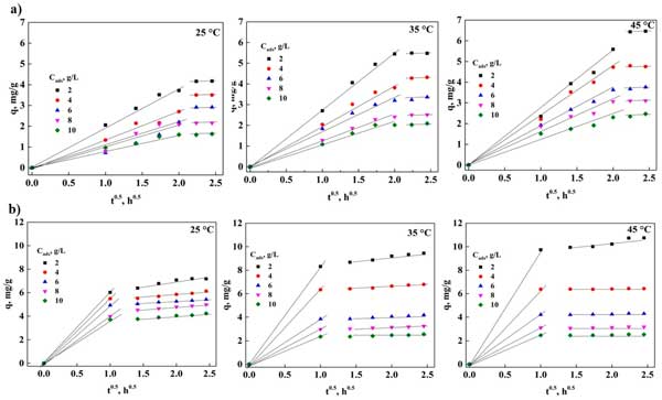 外部和粒子內(nèi)傳質(zhì)過程的分析可以對(duì)3,5-二硝基水楊酸的吸附產(chǎn)生顯著影響,在去除3,5-二硝基水楊酸時(shí)可能存在由于物質(zhì)傳輸造成的限制,這有必要對(duì)這種現(xiàn)象進(jìn)行分析。圖2a是以外擴(kuò)散模型為基礎(chǔ)構(gòu)建的,從中可以看出,對(duì)于活性炭,在吸附過程中接觸長達(dá)6小時(shí)的實(shí)驗(yàn)點(diǎn)處存在一條直線,這表明存在以下可能性,在任何溫度的過程中通過外部傳質(zhì)控制。圖2b顯示了粉末活性炭在3,5-二硝基水楊酸吸附中獲得的實(shí)驗(yàn)數(shù)據(jù)的表示,其中在與吸附劑接觸1小時(shí)時(shí)觀察到一條直線。這表明使用活性炭粒子不存在外部傳質(zhì)問題,因?yàn)?,5-二硝基水楊酸會(huì)迅速從溶液中去除,擴(kuò)散到表面。此外,這表明活性炭顆粒中的吸附過程可能是由于表面存在的官能團(tuán)。根據(jù)這些結(jié)果,確定是否也存在內(nèi)部傳質(zhì)問題很重要,從而能夠確定3,5-二硝基水楊酸刪除過程是否受到這種現(xiàn)象的存在的顯著影響。