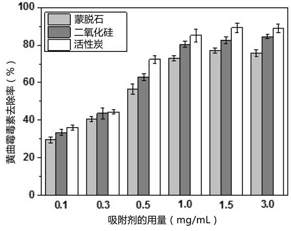 三種吸附劑對(duì)AFB1的吸附在25℃下進(jìn)行24小時(shí)。圖1顯示了活性炭和其它吸附劑用量的AFB1去除率。無論吸附劑劑量如何,使用活性炭時(shí)去除率更高,其次是二氧化硅和天然蒙脫石。正如預(yù)期的那樣,AFB1的去除率隨著吸附劑劑量的增加而增加,這可以通過AFB1與吸附劑之間的相互作用增加來解釋,包括氫鍵、孔填充和靜電吸引力。吸附劑量為1.0mg/mL時(shí),黃曲霉毒素的去除率使用蒙脫石、二氧化硅和活性炭時(shí),分別為73.23%、80.35%和85.09%。在較高的吸附劑量(1.5mg/mL)下,去除率分別略微增加至75.56%、83.48%和89.15%。在這個(gè)吸附系統(tǒng)中,當(dāng)吸附劑以較低濃度使用時(shí),可用的吸附位點(diǎn)較少。因此,增加吸附劑濃度有效地增加了吸附位點(diǎn)的數(shù)量,從而提高了AFB1的去除率。但濃度過高時(shí),吸附劑顆粒間會(huì)發(fā)生膠結(jié)、絮凝和團(tuán)聚現(xiàn)象。這導(dǎo)致可用吸附位點(diǎn)的數(shù)量穩(wěn)定或減少,并且去除率沒有進(jìn)一步提高。此外,當(dāng)吸收劑以高濃度使用時(shí),可能會(huì)消除維生素E和甾醇等微量營養(yǎng)素,從而導(dǎo)致營養(yǎng)流失。因此,使用濃度為1.0mg/mL的吸附劑被認(rèn)為是合適的,因此在進(jìn)一步的實(shí)驗(yàn)中被采用。