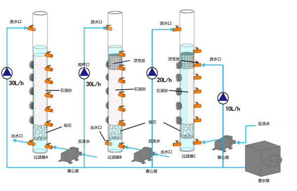 試驗裝置如圖1所示,主體結(jié)構(gòu)采用有機(jī)玻璃制成,內(nèi)徑70mm,高度2000mm。過濾器包括進(jìn)水管、出水管、反沖洗水管、支撐層和過濾介質(zhì)層。200毫米高的支撐層由礫石制成。粒徑為0.5-1mm,和分別為1-2mm,過濾層的填料為石英砂和椰殼活性炭。過濾器A的填料層為1000mm石英砂。過濾器B、C的填料層均為上層200mm椰殼活性炭和下層800mm石英砂。根據(jù)水廠的設(shè)計規(guī)范,過濾器的過濾速度為8m/h,進(jìn)水流量為30L/h。過濾器A和B為單點進(jìn)水,過濾器C為兩點進(jìn)水,兩個進(jìn)水點分別位于過濾器頂部和20cm深度處;第一進(jìn)水點流量為20L/h,第二進(jìn)水點流量為10L/h。過濾器A和B是過濾器C的空白對照。過濾器每24小時反洗一次。