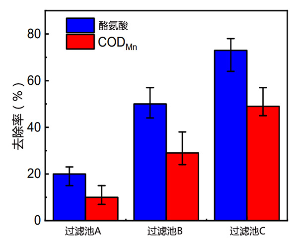 活性炭濾池出水二氯乙腈前體酪氨酸和CODMn的平均去除率如圖2所示。實驗過程中,三個活性炭過濾器出水酪氨酸濃度依次下降:過濾器C(73%)>過濾器B(50%)>過濾器A(20%)(p<0.05)。生物濾池出水的酪氨酸濃度低于進(jìn)水。誰記錄了飲用水處理廠生物過濾后出水中DON濃度的增加,表明DON總體出水濃度的變化并不代表個體的變化,而是過濾器中不同個體的變化規(guī)律也不同。平均出水CODMn去除率的變化趨勢與平均出水酪氨酸去除率一致。CODMn去除率可以反映生物濾池中有機(jī)物的去除情況。酪氨酸是一種有機(jī)物,其分子結(jié)構(gòu)中含有還原性酚羥基和氨基,可被高錳酸鉀氧化。因此,CODMn去除率也可以作為酪氨酸去除的依據(jù)。