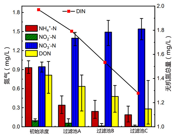 飲用原水中的氮主要以NH4+-N、NO2-N、NO3N和有機(jī)氮的形式存在。本實驗中的大部分有機(jī)氮是酪氨酸。在生物濾池中,溶解無機(jī)氮(DIN)和DON是相互轉(zhuǎn)化的,因此有必要討論活性炭濾池中向氮的轉(zhuǎn)化。進(jìn)出活性炭濾池的水中氮的變化如圖3所示。溶解無機(jī)氮損失為活性炭濾池C>B>A(p<0.05),與CODMn的去除率一致。過濾器對有機(jī)物的利用隨著溶解無機(jī)氮損失的增加而增加,表明反應(yīng)中的溶解無機(jī)氮損失現(xiàn)象與過濾器反硝化有關(guān)。