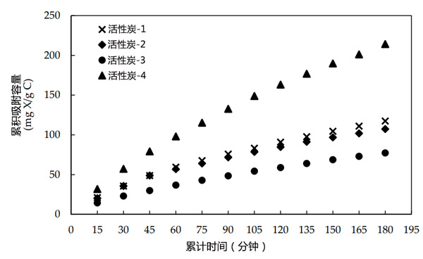 活性炭是去除有機物的常用吸附劑。吸附性能主要取決于其比表面積和微孔結(jié)構(gòu)。它們具有較高的內(nèi)部孔隙率,因此具有較高的吸附性。在本研究中,對四種具有不同表面性質(zhì)的顆;钚蕴繕悠(活性炭-1、2、3和4)進行了去除黃藥的測試。將兩克活性炭樣品與50毫升1590毫克/升的黃藥溶液混合15分鐘。過濾活性炭,并用紫外-可見光譜法測量溶液中的殘余黃藥。通過重復使用碳樣品,重復該程序12次,以達到大吸附量。如圖1所示,活性炭-4的吸附容量比較高,因此選擇其進行進一步研究。