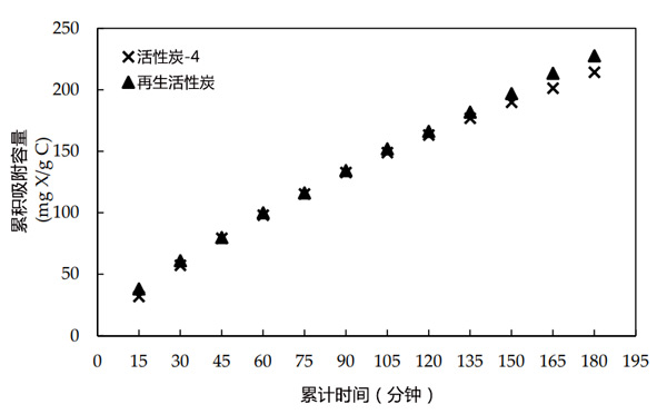 活性炭具有一定的吸附能力。隨著越來越多的成分被吸附在其表面上,吸附能力會隨著時間的推移而降低。一旦達到最大吸附容量,就不能再有效使用。對于活性炭樣品的再生,吸附的成分可以通過加熱破壞。在這部分研究中,在其表面吸附黃原酸鹽的廢活性炭樣品通過在550℃下加熱1小時進行再生。圖2比較了初始活性炭和再生活性炭樣品的吸附性能。再生活性炭和活性炭樣品的累積吸附黃藥量相差不大。結(jié)果表明,吸附在用過的活性炭上的黃藥被破壞了,它被有效地恢復并可以重復使用。