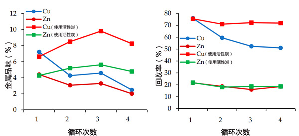 圖4:使用活性炭和不使用活性炭進行水處理時,Cu和Zn的品位和對粗銅精礦的回收率。