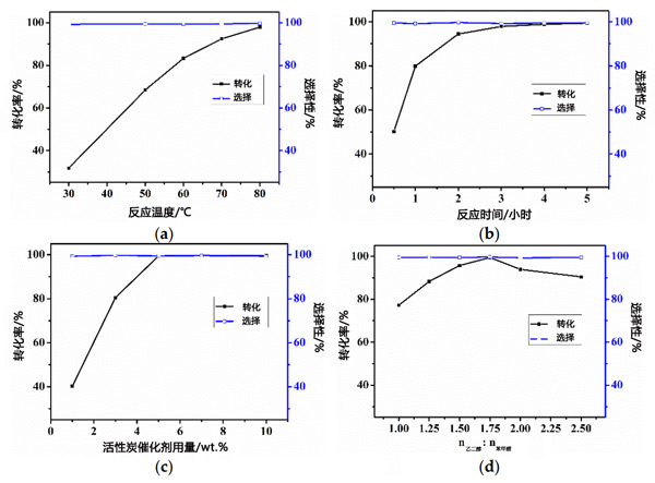 以苯甲醛與乙二醇的縮合反應(yīng)為探針反應(yīng),研究了活性炭在縮醛和縮酮合成中的催化性能。一般程序如下:10mL溶劑環(huán)己烷、25mmol苯甲醛,將43.75mmol乙二醇和0.13g活性炭催化劑在配備有溫度計(jì)和回流冷凝器的三頸燒瓶中混合,并在80℃下反應(yīng)5小時。測試了反應(yīng)溫度、反應(yīng)時間、催化劑用量和乙二醇/苯甲醛摩爾比對苯甲醛轉(zhuǎn)化率的影響。同時,測試了活性炭在苯甲醛與乙二醇縮合反應(yīng)中的催化回收性能,并討論了不同基材的適用性。