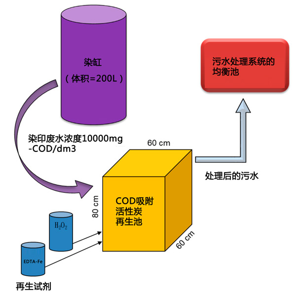 根據(jù)獲得的數(shù)據(jù)和當(dāng)前的紗線染色工藝,使用所提出的兩步處理系統(tǒng)處理來自常用的200L染浴的高COD染色廢水看起來適用,并提出了建議如圖3所示。據(jù)我們所知,目前運營的染色設(shè)施中沒有這種建議的設(shè)置。設(shè)計容積(即200L)足以容納一批染缸出水,使高COD廢水可直接進入擬建裝置的吸附和再生。根據(jù)結(jié)果,去除50-60%的COD將大大減少回流到平衡罐的COD,從而避免現(xiàn)有廠內(nèi)生物處理單元的過載情況。為了運行所提議的裝置,首先,將來自染色池的一定量的高COD廢水引導(dǎo)至充滿指定活性炭的反應(yīng)單元(如果處理120L廢水,則為20kg)進行24小時吸附。由于結(jié)果表明染浴出水COD在酸性pH值下吸附更多,二是對處理后的廢水進行篩分,24小時后排至其廢水處理設(shè)施的頭部(即平衡池)。第三,分別串聯(lián)添加初始濃度為2.12mmol/dm3和2.5%的乙二胺四乙酸鐵鈉和過氧化氫,以啟動活性炭再生1小時。從連續(xù)運行來看,兩步法處理高COD染色廢水的應(yīng)用前景看好。然而,我們確實注意到該技術(shù)的當(dāng)前應(yīng)用可能僅限于染浴設(shè)計及其操作。染浴的高COD流出物發(fā)生在染色過程的第一次排放,但對于大多數(shù)可用的染浴操作,根據(jù)不同的COD濃度對每批流出物進行分離是不適用的。一些染色裝置或染色工藝的改造被認為是必要的。