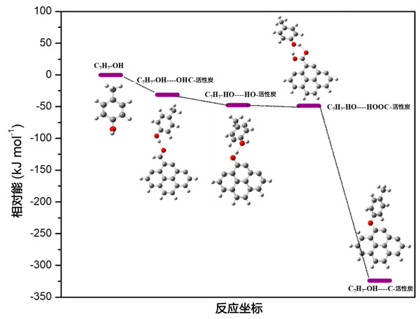 對(duì)對(duì)甲酚分子與原始活性炭、活性炭-COOH、活性炭-OH和活性炭-CHO相互作用的吸附能進(jìn)行了比較研究,以確定甲酚吸附的最佳可能相互作用類型。圖2給出了能量分布圖。對(duì)甲酚與原始和功能化活性炭的吸附能顯示出較高的負(fù)能,表明甲酚與原始和功能化活性炭的相互作用是有利的。然而,與功能化活性炭相比,原始活性炭對(duì)甲酚的吸附能更負(fù),表明原始活性炭,即具有高度不飽和度的活性炭,將更有利于甲酚吸附。
