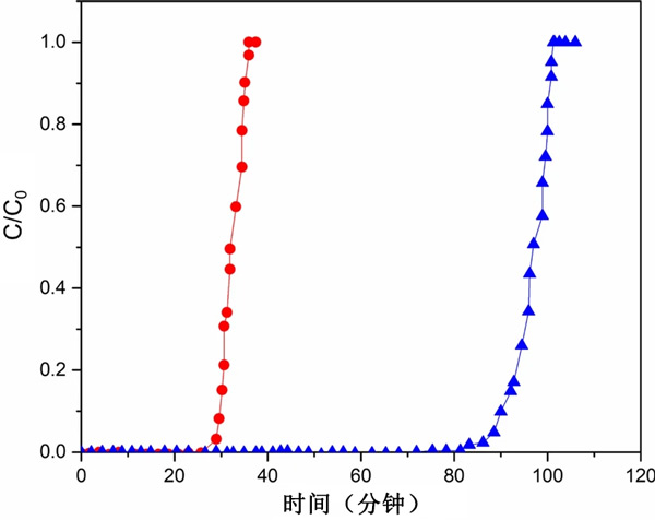 圖4:活性炭(黑色實心圓圈)和堿處理的活性炭(黑色實心三角形)在35℃下填充床柱中HCl吸附的突破曲線。