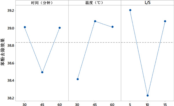 田口法用于優(yōu)化參數(shù),即時間、溫度和L/S,這些參數(shù)直接取決于苯酚的去除。選擇田口方法的選項(xiàng)越大越好。本研究的主要目的是活性炭從廢水中去除較多的苯酚,因此選擇了越大越好的選項(xiàng)。此外,采用添加劑模型來確定各個輸入?yún)?shù)對去除苯酚濃度的影響。這種分析稱為因子效應(yīng)的確定,結(jié)果見圖2。