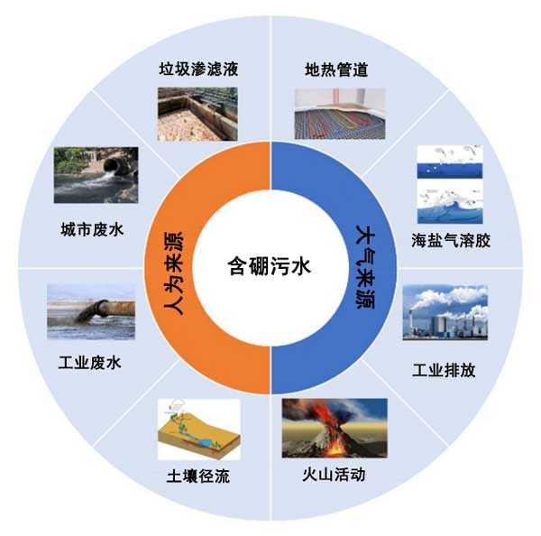 硼通過礦物提取、煤炭燃燒、含硼砂產(chǎn)生的清潔劑的廢水排放、硼肥等應(yīng)用以及硼化物處理的木材的副燃燒進(jìn)入水環(huán)境(圖1)。由于人類活動的影響,已經(jīng)觀察到地下水和地表水中的硼濃度增加。硼在水生環(huán)境中的存在會對環(huán)境造成很大的影響。但從工業(yè)設(shè)施對硼的需求增加,水資源中硼的含量增加,水質(zhì)標(biāo)準(zhǔn)變得更加嚴(yán)格。所以需要去除水中的硼來修復(fù)環(huán)境。脫硼方法包括膜分離、活性炭吸附、(電)凝聚和沉淀、萃取以及這些方法的組合。