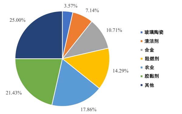 硼是自然界七大必需微量元素之一,少量的硼攝入有利于植物細(xì)胞膜保持其結(jié)構(gòu)和功能的完整性,并維持正常的發(fā)育和物質(zhì)運(yùn)輸。硼不僅是生物體必需的微量元素,也是許多工業(yè)的重要原料,如制造業(yè)和農(nóng)業(yè)。根據(jù)近期的統(tǒng)計(jì)數(shù)據(jù),僅硼酸鹽就有300多種應(yīng)用,全球四分之三以上的硼消耗量來自陶瓷、洗滌劑、化肥和玻璃(圖2)。在生產(chǎn)過程中,硼酸鹽是制造各種特殊玻璃和陶瓷的主要成分。在高級玻璃和玻璃纖維的生產(chǎn)中使用硼硅酸鹽可以提高玻璃的耐熱性和透明度,有利于提高其化學(xué)穩(wěn)定性以及抗機(jī)械和熱沖擊的能力。在瓷釉中加入硼可以防止脫釉和開裂,提高產(chǎn)品的光澤度和耐久性。在瓷體中加入硼酸鹽有利于降低能耗,提高產(chǎn)品的機(jī)械強(qiáng)度。硼還用于生產(chǎn)微合金鍛鋼并提高鋼的沖擊強(qiáng)度。在農(nóng)業(yè)領(lǐng)域,硼被用于生產(chǎn)含硼化肥等產(chǎn)品。但是灌溉水中的硼含量升高會直接導(dǎo)致動植物中毒造成危害,所以一定要控制排放。