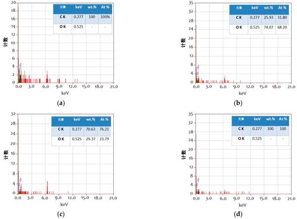 通過觀察摩擦學(xué)測試的結(jié)果,很明顯平均磨痕直徑和質(zhì)量損失的減少結(jié)果具有相似的趨勢。然而,當(dāng)將活性炭添加到潤滑脂中時,質(zhì)量損失值顯示出更陡峭的趨勢。為了進(jìn)一步了解質(zhì)量損失結(jié)果以及表面的磨痕形貌,應(yīng)用了與能量色散X射線(EDX)系統(tǒng)集成的SEM。測試氣缸磨痕的EDX光譜是針對放大500倍的SEM圖像確定的,以便從磨痕的表面軌跡中獲得關(guān)于接觸表面上的摩擦膜的沉淀元素(碳和氧)的必要信息。圖3顯示了以500倍放大倍率成像時的磨損表面形態(tài)。在具有粗糙表面形態(tài)的商業(yè)油脂樣品的情況下,圖像描繪了淺槽和深槽(圖3a)。另一方面,活性炭樣品和2wt.%其他樣品的磨損表面(圖3b,c)顯示出淺槽,帶有少量深槽點(diǎn)和光滑的形貌,而在0.5wt.%活性炭+2wt.%其他樣品的混合樣品僅顯示出薄槽(圖3d)。