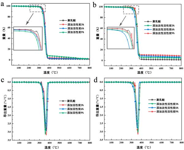 熱重分析結(jié)果列于圖3中。所有樣品均呈現(xiàn)單一熱降解階段,但5%質(zhì)量損失溫度(T5%)或熱降解速率最高溫度(Tmax)略有不同。純聚乳酸在322℃時開始快速降解,如圖3a所示,其Tmax達到363℃,并且在400℃時幾乎所有質(zhì)量都損失了。在800℃的終端溫度下測得相應(yīng)的殘?zhí)柯蕛H為1.35%。相比之下,當(dāng)應(yīng)用改性活性炭時,酸性添加劑(磷酸鹽)會促進聚乳酸復(fù)合材料的較早分解,這與之前的結(jié)果一致。殘?zhí)柯孰S著復(fù)合材料中改性活性炭的加載而逐漸增加。純聚乳酸和改性活性炭復(fù)合材料的Tmax幾乎沒有差異,分別為363℃、364℃、357℃和363℃。因此可以看出,改性活性炭負載對聚乳酸降解沒有影響。在600℃到800℃的范圍內(nèi),聚乳酸燃燒的殘余物沒有質(zhì)量變化,但在一定程度上可以觀察到輕微的質(zhì)量損失,表明加入改性活性炭后復(fù)合材料的燃燒延遲。