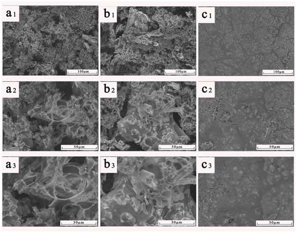 當(dāng)加載足夠的改性活性炭時,膨脹的殘余碳可以通過其質(zhì)量、連續(xù)性和致密性得到證實,這些都得到了極大的改善。一般來說,膨脹的殘余碳可以減少凝相和氣相之間潛在的熱和傳質(zhì),這反過來又會引起燃燒抑制。經(jīng)過錐形量熱儀測試后如圖4中的圖案所示,可以注意到殘留碳的顯著形態(tài)差異。在改性活性炭6%和改性活性炭9%的表面上可以看到空隙和裂口(圖4a1、b1),它們可以作為熱量的擴散途徑,并且在燃燒過程中會揮發(fā)。此外,相比之下,改性活性炭9%在表面提供了精細的皺紋覆蓋層(圖4c1),這產(chǎn)生了有效的凝聚相阻燃性,此外,皺紋形態(tài)可以作為復(fù)合材料的增強框架。