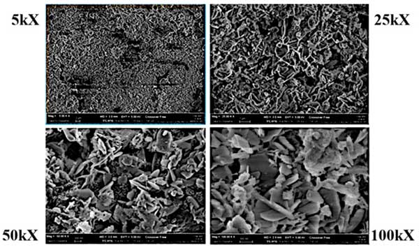 采用掃描電子顯微鏡(SEM)結(jié)合EDS分析來表征吸附劑樣品。局部化學(xué)分析通過EDS(能量色散X射線光譜法)實(shí)現(xiàn)。定性分析是通過識別光譜中報告的線來實(shí)現(xiàn)的,而定量分析(確定元素組成百分比)是通過測量樣品中存在的每種元素的線強(qiáng)度來進(jìn)行的。圖1顯示了一系列活性炭的SEM圖像,放大倍數(shù)遞增:5000、25,000、50,000、100,000倍。SEM圖像說明了活性炭的多孔結(jié)構(gòu),突出了樣品表面不連續(xù)性的存在。高孔隙率的存在對于限制鼓風(fēng)機(jī)系統(tǒng)過濾沼氣的能量損失是必要的。正如我們之前的一些研究報道的那樣,SEM圖像與EDS分析相結(jié)合可用于突出硫在孔隙和金屬基催化位點(diǎn)內(nèi)的吸附和保留。
