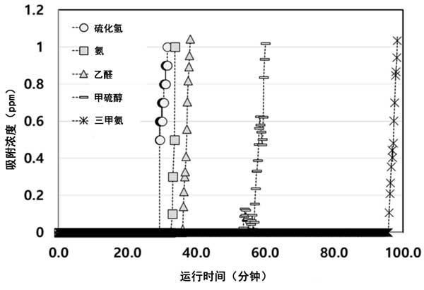 為了評估活性炭對不同廢氣的有效吸附量,應(yīng)研究其吸附能力。廢氣的氣味閾值和刺激水平在十億分之一的水平。吸附劑的總吸附容量很難用作從廢物中去除廢氣的設(shè)備的設(shè)計(jì)因素。因此,我們根據(jù)突破點(diǎn)計(jì)算了小于1ppm的有效吸附量。突破柱實(shí)驗(yàn)在304不銹鋼管式反應(yīng)器中進(jìn)行,總流量為1L/min,其中包含硫化氫(H2S)、氨(NH3)、乙醛(AA)、甲硫醇(MM)和三甲胺(TMA),如圖2所示。突破曲線依次為H2S、NH3、AA、MM、TMA。與廢氣相比,TMA具有更好的動(dòng)態(tài)吸附性能,因?yàn)樗哂懈L的突破時(shí)間和相應(yīng)的更大的有效吸附容量(<1ppm)。