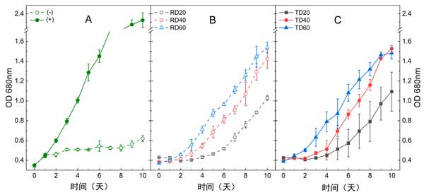 厭氧消化物中存在的大量和微量營(yíng)養(yǎng)素的多樣性可能有利于藍(lán)藻代謝。即使活性炭預(yù)處理顯著降低了幾個(gè)參數(shù),包括COD、濁度和苯酚含量,原料(4405mg/L)和預(yù)處理消化物(4220mg/L)的銨濃度仍然高于藍(lán)藻螺旋藻支持的閾值濃度(100–150毫克/升)。在這種情況下,使用以三種不同稀釋率稀釋的原始和預(yù)處理消化物進(jìn)行了一系列藍(lán)藻毒性測(cè)定:20×、40×和60×。未稀釋的消化物,無論是否用活性炭處理,都沒有在本實(shí)驗(yàn)中進(jìn)行測(cè)試,因?yàn)槌醪脚囵B(yǎng)分析表明它們對(duì)培養(yǎng)物毒性太大(數(shù)據(jù)未顯示)。因此,該實(shí)驗(yàn)的目的是比較以不同稀釋率稀釋的兩種消化物以及兩個(gè)對(duì)照組之間的生長(zhǎng)性能。連續(xù)測(cè)量680nm處的OD超過10天,以評(píng)估所有條件下的生長(zhǎng)情況。在三種不同稀釋因子下測(cè)試的原始消化物(RD)和處理過的消化物(TD)條件下,觀察到類似生長(zhǎng)趨勢(shì)(圖2A、B)。當(dāng)增加原始和預(yù)處理消化物的培養(yǎng)基稀釋倍數(shù)時(shí),會(huì)產(chǎn)生更高的生長(zhǎng)反應(yīng)。同樣,滯后期受原始消化物和預(yù)處理消化物的稀釋因子的影響,觀察到的滯后期越長(zhǎng),消化物越濃縮。例如,稀釋20倍和40倍的未處理消化物的滯后期分別持續(xù)4天和2天。在本研究中,根據(jù)稀釋倍數(shù)和預(yù)處理?xiàng)l件,使用221和71mg/L之間的初始銨氮(NH4+-N)濃度,鈍頂藻能夠增殖。一般而言,原始消化物和預(yù)處理消化物的更高稀釋度產(chǎn)生更高的生長(zhǎng)。