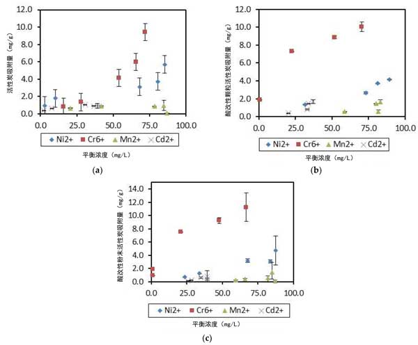 圖2:金屬離子在不同吸附劑上的吸附等溫線(a)活性炭,(b)酸處理顆;钚蕴,和(c)酸處理粉末活性炭。