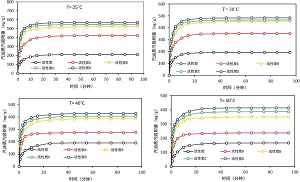 經(jīng)過進(jìn)一步研究,發(fā)現(xiàn)活性炭D樣品比其他樣品更能增強汽油蒸汽吸附,這表明表面結(jié)構(gòu)在捕獲分子方面的重要性和關(guān)鍵作用,正如預(yù)期的增強吸附一樣。事實上,與其他合成樣品相比,活性炭樣品具有更高的表面積和豐富的微介孔,可以顯著提高吸附量圖2。我們還研究了活性炭用量對吸附容量的影響。正如發(fā)現(xiàn)的那樣,隨著活性炭的用量增加,蒸汽吸附能力可以進(jìn)一步提高,這可能是由于通過提高活性炭量,表面積和孔隙反而增加,進(jìn)而可能有助于增強吸附。鑒于發(fā)現(xiàn)隨著活性炭用量比從1增加到4,汽油蒸氣吸附能力提高。