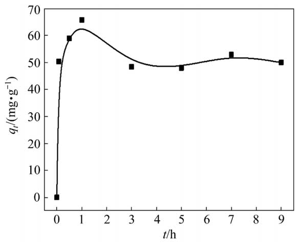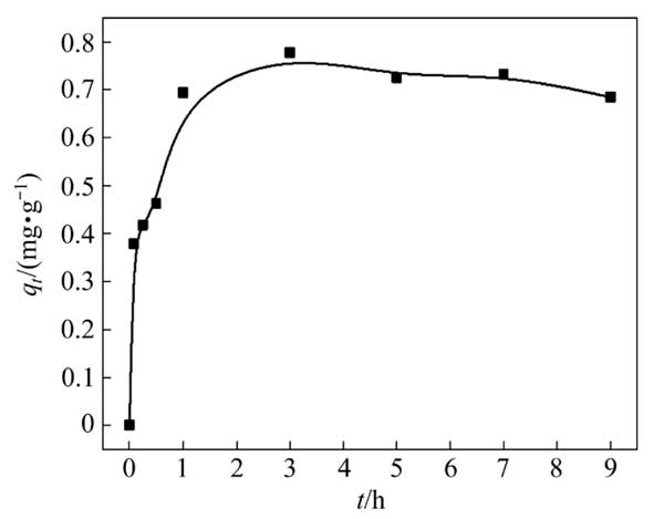 用100mL硫代硫酸銅溶液進(jìn)行銅吸附動(dòng)力學(xué)試驗(yàn),初始銅濃度為3g/L。硫代硫酸鹽與銅的摩爾比為8:1。除另有說明外,0.5g活性炭用于吸附試驗(yàn)。圖2顯示了Cu(S2O3)23−在活性炭上的吸附動(dòng)力學(xué);钚蕴繉(duì)銅的吸附容量在前1h急劇增加,隨后略有下降并趨于穩(wěn)定。
