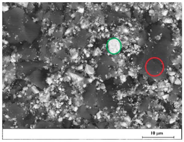 圖1:活性炭混合物顆粒的SEM圖像(綠色圓圈對應(yīng)重晶石顆粒,紅色圓圈對應(yīng)活性炭顆粒)。