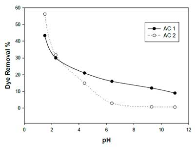 考察了溶液酸度對(duì)活性炭對(duì)檸檬黃吸附的影響,初始pH范圍為1.5〜11.0,見圖1。吸附研究在37℃進(jìn)行。染料的典型pH值與百分比的去除在較高的pH值下顯示出染料百分比的顯著降低。觀察到pH值高于6.0的染料吸收的減少,此后觀察到吸附量沒(méi)有變化。對(duì)于AC1和AC2,在pH1.5分別達(dá)到染料的最大攝取(43.4和56.2%)。因此,選擇pH 1.5作為進(jìn)行后續(xù)研究的最佳值。該pH值也是人類胃的近似pH值。得到的結(jié)果表示因質(zhì)子化而增加中和吸附劑表面上的負(fù)電荷,這有利于擴(kuò)散并提供吸附劑的更多活性表面,由此在其表面處產(chǎn)生更大的吸附。溶液的pH控制吸附劑和被吸附物之間的靜電相互作用。隨著pH的增加,去除百分比的降低可能是由于去質(zhì)子化,這阻礙了吸附劑和山梨酸之間的靜電力,導(dǎo)致吸附能力降低。pH對(duì)AC吸附容量的影響與以前水溶液中吸收酒石黃的結(jié)果是一致的。