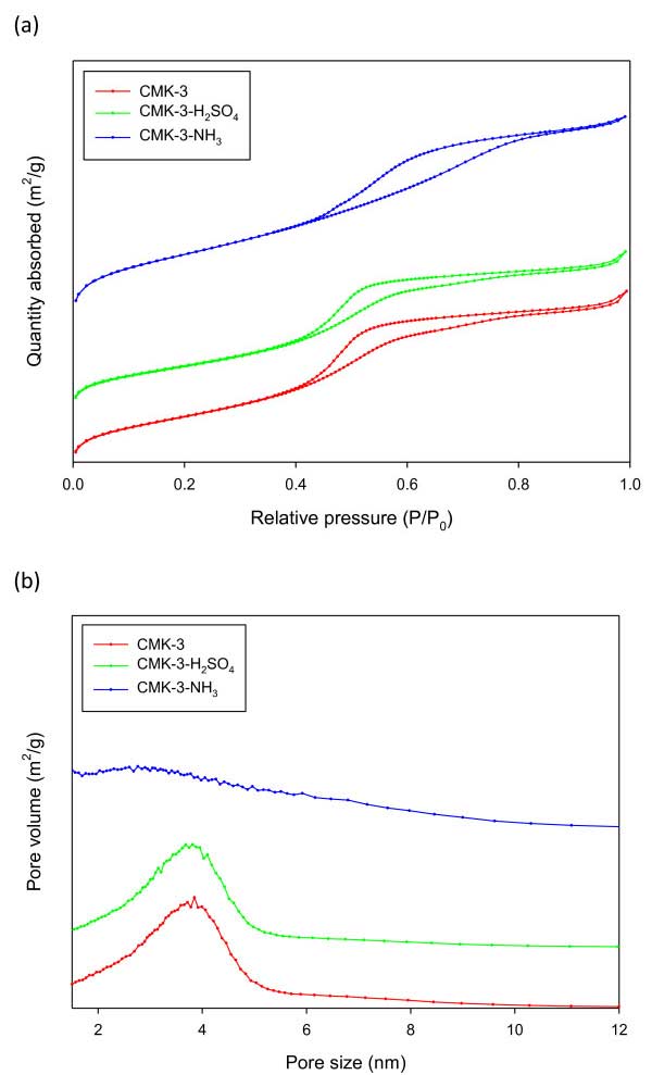 表1列出了本研究中使用的活性炭的物理性質(zhì)。活性炭-3的比表面積為1178m 2 / g。經(jīng)硫酸處理后比表面積略有下降至1,002m 2 / g,經(jīng)氨處理后比表面積大幅度上升至1663m 2 / g。圖2示出了氮?dú)馕降葴鼐和孔碳的孔隙大小分布。圖2a示出了用于活性炭-3,活性炭-3-H的氮吸附等溫線2 SO 4,和活性炭-3-NH 3。所有樣品在0.5 的相對壓力(P / P 0)下都顯示典型的介孔材料的IV型等溫線。表表11表明,CMK-3具有的3.8納米的孔徑中孔。用硫酸處理后維持這些中孔。當(dāng)活性炭-3用氨處理時,平均孔徑減小到3.1nm。氨處理是高溫(900℃)工藝,其產(chǎn)生微孔,引起表面積的大量增加和平均孔徑的減小。另一方面,大部分介孔活性炭-3在氨處理后保持。