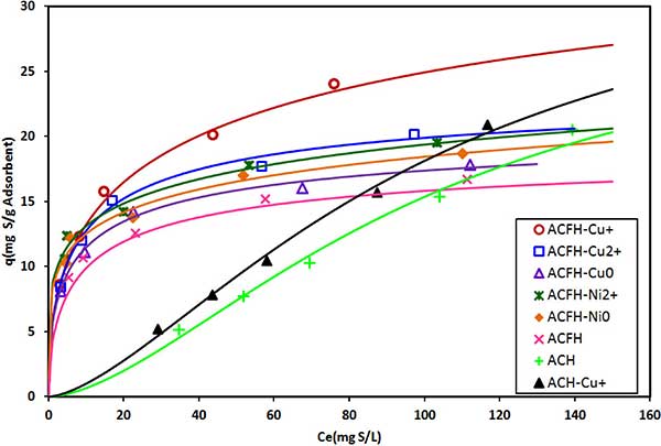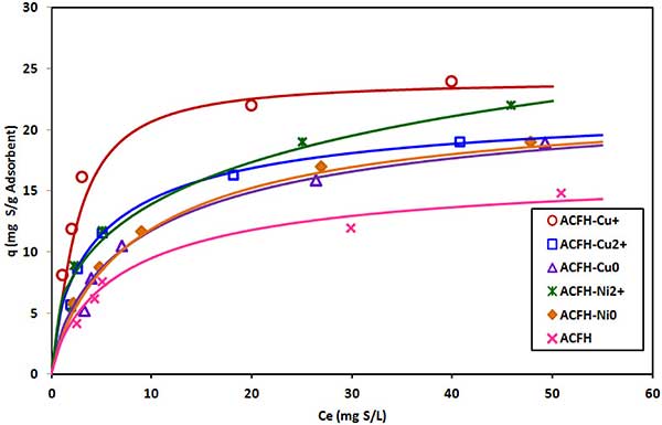 圖1. DBT在浸漬有不同銅和鎳物質(zhì)的活性炭上的吸附等溫線(xiàn)。