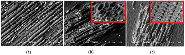 圖1、鋸末(×200)(a),生物炭(b)和活性炭(c)的SEM-BSI圖像。