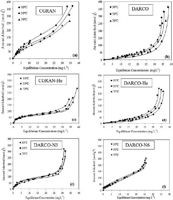 評估原樣處理的活性炭對松香酸的吸附情況,結果如圖1所示。該圖描繪了在處理前和后處理的CGRAN和DARCO活性炭的三種溫度(30,50和70℃)下作為平衡濃度函數(shù)的吸附容量。從先前對吸附速率的研究(此處未顯示),確定在30分鐘達到吸附平衡。根據(jù)分類等溫線,CGRAN和CGRAN-He(圖1a和1c)顯示了“L”型等溫線,這是樅酸和吸附位點之間強親和力的特征。DARCO(圖1b)和DARCO-He(圖1d)活性炭表現(xiàn)出“S”型等溫線,歸因于溶質和溶劑之間競爭吸附的結果,松香酸對吸附位點的親和力較低。圖1e和1f所示的HNO3氧化樣品(DARCO-N3和DARCO-N6)的 等溫線為“L”型吸附等溫線,樅酸和溶劑之間具有強親和力的特征。26,27另外,DARCO-N3展示了一個被歸類為“L2”的等溫線,其中平臺指示表面上的所有可用位點均分布在單層中,并且DARCO-N6根據(jù)“L1”子群顯示等溫線,其中沒有觀察到高原,表明未覆蓋單層。 這種行為與DARCO-N6顯示的更多的表面功能組一致。