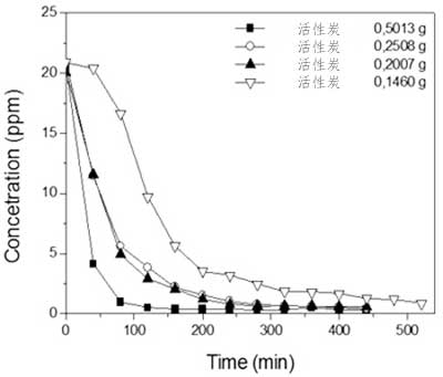 使用不同的質(zhì)量對(duì)活性炭的4-硝基酚吸附容量清楚地表明,在較低的質(zhì)量下,以mg g-1表示的吸附容量較高,盡管這是在較高的飽和時(shí)間獲得的。這偏離了預(yù)期,因?yàn)槲饺萘繎?yīng)該標(biāo)準(zhǔn)化為每克吸附劑,因此應(yīng)當(dāng)獨(dú)立于所使用的吸附劑質(zhì)量。這個(gè)意想不到的結(jié)果主要是由于擴(kuò)散問題,例如搖動(dòng),意味著當(dāng)降低間歇系統(tǒng)中的擴(kuò)散阻力時(shí)獲得更高的效率,導(dǎo)致4-硝基酚溶液更均勻的分布,同時(shí)溶液之間質(zhì)量增加的接觸減少和吸附劑。