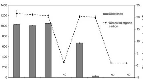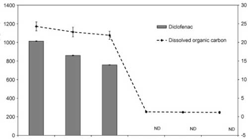 使用活性炭除去雙氯芬酸鈉是定性高效的,通過(guò)零吸收和低濃度的DOC的,并且在通過(guò)所獲得的色譜中沒有檢測(cè)到雙氯芬酸鈉。得在所研究的處理階段中,在活性炭上的吸附導(dǎo)致最顯著的雙氯芬酸鈉去除。因此,雙氯芬酸鈉沒有水樣中的這個(gè)階段(LOD之后檢測(cè) = 2 μg L−1)?紤]到所述方法的定量限為3 μg L−1,通過(guò)活性炭除去雙氯芬酸鈉的至少99.7%。因?yàn)闆]有研究活性炭的破裂曲線,所以活性炭的結(jié)果可以被認(rèn)為是定性的。然而,為了研究在大型水處理廠中去除雙氯芬酸鈉,必須改進(jìn)該方法以達(dá)到較低的檢測(cè)限(約μg L−1)。