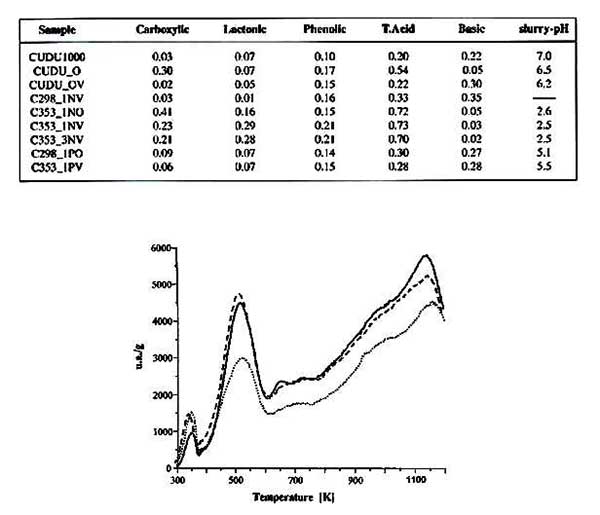 圖1顯示了過氧化氫處理后產生的活性炭的化學行為。從上面看出的氧化過程增加了活性炭的總酸度,并且與羧基和酚類基團的增加一致。此外,TPD曲線顯示了放出氣體的增量,峰值集中在與活性炭相同的溫度。低溫和高溫分解組的面積總體增加歸因于羧基-內酯類結構和后面的酚類基團。H2O2氧化碳的FT-IR光譜在1542和1190cm-1處顯示帶就像那些原始的碳,但后來的孔隙已經擴大,顯示出C-O伸展模式的增加?傊,這些研究表明僅在H的性質的小變化H2O2處理過的碳,即,是在氧化時,其類似于由其他研究人員報告的行為沒有觀察到變化顯著。其中過氧化氫溶液的氧化作用明顯地看作羧酸類基團的重要減少,伴隨著堿性基團的大量增加。