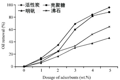 通過(guò)改變吸附劑的重量,以100rpm的混合速率,1小時(shí),分析不同吸附劑用量(wt。%)對(duì)活性炭與沸石相比對(duì)MEA去除殘留油的影響;旌蠒r(shí)間,在25-30℃的溫度下接觸時(shí)間為1小時(shí)。測(cè)試在樣品的原始pH下進(jìn)行,即11.21。在CO 2去除單元系統(tǒng)中根據(jù)需要維持pH水平。圖1顯示了使用活性炭和沸石從MEA廢水中去除殘留油的百分比。從圖1中可以看出觀察到,在最高吸附劑用量(5重量%)下,活性炭與其他物質(zhì)相比顯示出最高的殘油去除率;钚蕴砍晒Τ87%的殘油,沸石為46%?梢缘贸鼋Y(jié)論,活性炭最好比其他吸附劑更好地除去殘油。