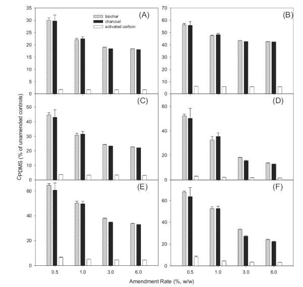 在平衡時,通過活性炭吸附或隔離PBDEs反映了它們在PDMS纖維(C PDMS)上檢測到的水平的變化。在JL沉積物中,隨著活性炭修正,C PDMS顯著下降,并且活性炭的類型之間的減少不同(圖2)。例如,當(dāng)用生物炭以0.5%修正JL沉積物時,C PDMS降低至未沉降沉積物中的水平的30.0-67.8%。木炭(29.7-63.5%)的效果與生物炭相似(圖2)。相比之下,活性炭修正沉積物中C PDMS的下降幅度更大(圖2))。例如,在含有0.5%活性炭的JL沉淀物中,對于不同的同源物,C PDMS降低至未改良處理的水平的1.8-8.1%。平均而言,添加1.0%的活性炭導(dǎo)致所選BDE同系物的C PDMS降低至對照水平的1.7-5.9%,這表明活性炭在沉積物中螯合PBDEs的能力遠(yuǎn)遠(yuǎn)高于其他黑碳材料。