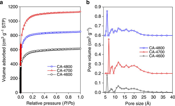 圖1、活性炭的孔隙率;罨奶急粯(biāo)記為CA-4T,其中4是活化KOH/碳比,T是活化溫度。顯示了氮吸附等溫線(a)和相應(yīng)的孔徑分布曲線(b)。