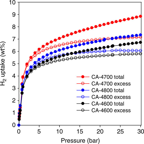 活性炭中的氫儲(chǔ)存需要具有最高表面積和適當(dāng)尺寸的孔的材料。在-196和25℃下使用重量法在HidenXEMIS分析儀上在0-30巴的壓力范圍內(nèi)研究活性炭的儲(chǔ)氫能力。圖2顯示了活性炭在-196℃下的過(guò)量和總氫吸收等溫線。對(duì)于所有CA-4T活性炭,氫吸收是可逆的,沒有滯后現(xiàn)象,并且在0-30巴的壓力范圍內(nèi)沒有達(dá)到飽和。我們首先注意到1巴的氫吸收非常令人印象深刻,在3.1-3.9wt%的范圍內(nèi)。這種儲(chǔ)氫比為高表面積活性炭?jī)A向于在2-3重量%范圍內(nèi)的任何報(bào)告的值高得多。我們將這種特別高的吸收特性歸因于非常高的微孔表面積和富氧表面的組合,特別是對(duì)于3.9重量%的活性炭樣品CA-4700。富氧表面的效果是對(duì)于活性炭樣品CA-4600,其盡管具有適度總表面積和微孔表面,仍然表現(xiàn)出的吸收比以前發(fā)現(xiàn)的活性炭材料具有高得多的表面積。經(jīng)過(guò)研究發(fā)現(xiàn),具有氧官能團(tuán)的活性炭效果預(yù)期在低壓下具有最大效果,其中氫和表面之間的相互作用比在較高壓力下更重要,其中通過(guò)空間填充機(jī)制更可能發(fā)生氫吸收。